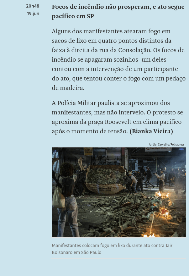 O vandalismo deu as caras na manifestação contra o presidente da República, Jair Bolsonaro, organizada no último sábado, 19. Ataques a profissionais de imprensa, incêndios e depredação de patrimônios privados foram registrados durante o ato.